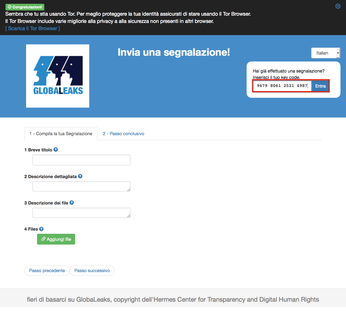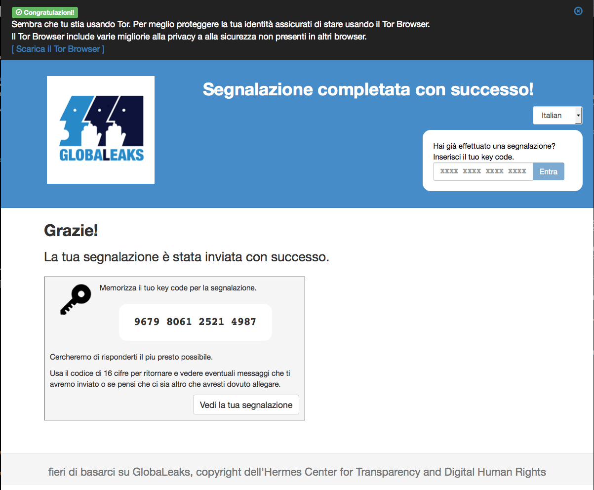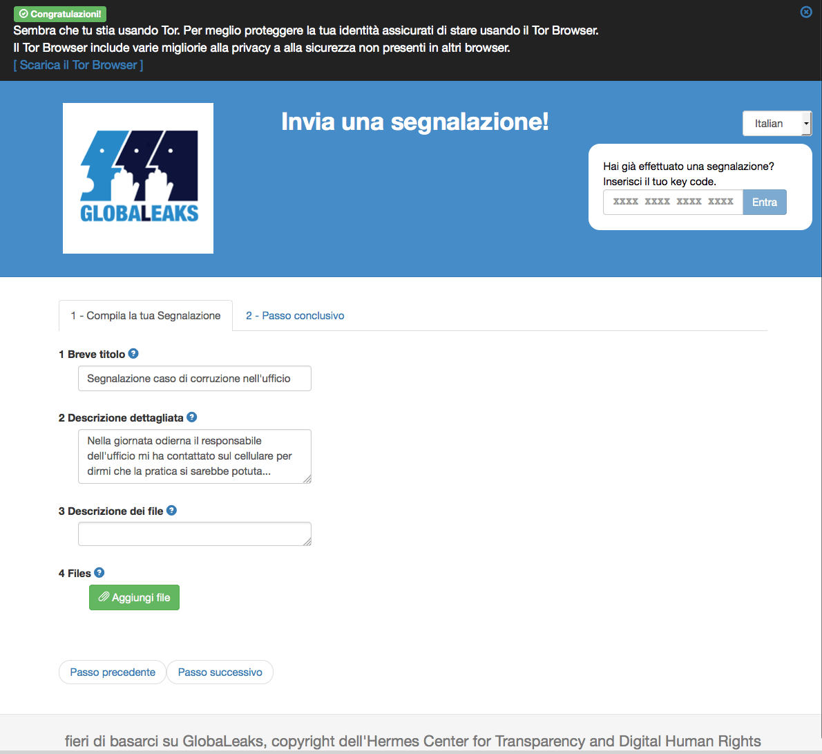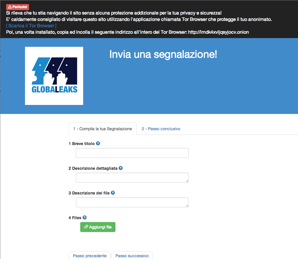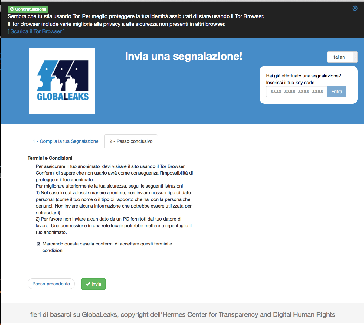 L’anonimato è garantito dal sistema Globaleaks e dal browser Tor