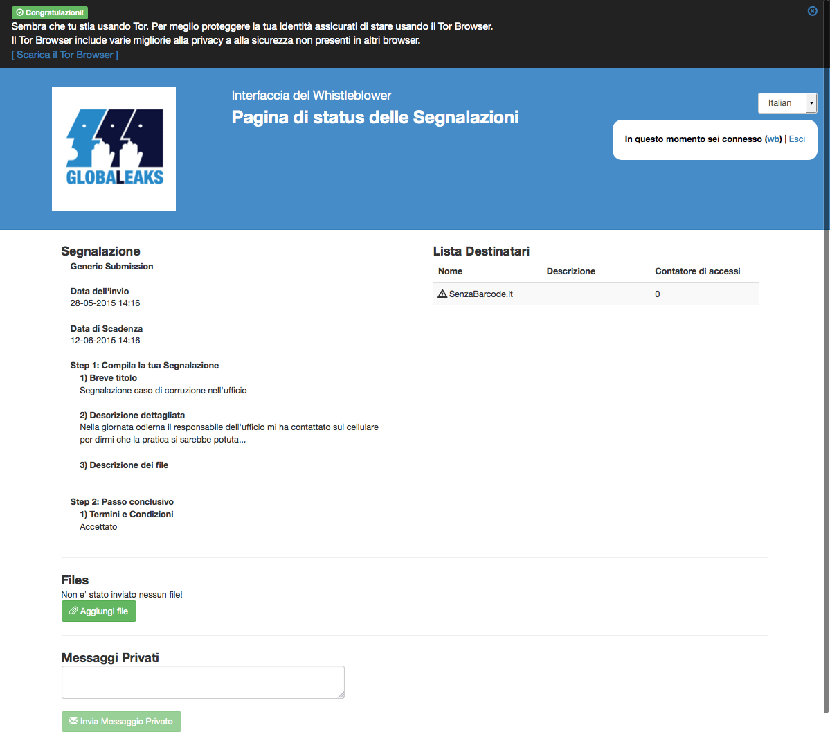 I riceventi (personale interno di SenzaBarcode) vaglieranno le segnalazioni e agiranno d conseguenza in maniera differente ed attenta per ogni segnalazione. Il whistleblowing è assolutamente legale e già collaudato da diversi anni. Grazie a Globaleaks c’è la possibilità di interagire con i riceventi della segnalazione, sempre in totale anonimato, è possibile inviare materiale pdf, jpg, mp3 etc. Inoltre è possibile accedere alla segnalazione più volte anche per integrarla.