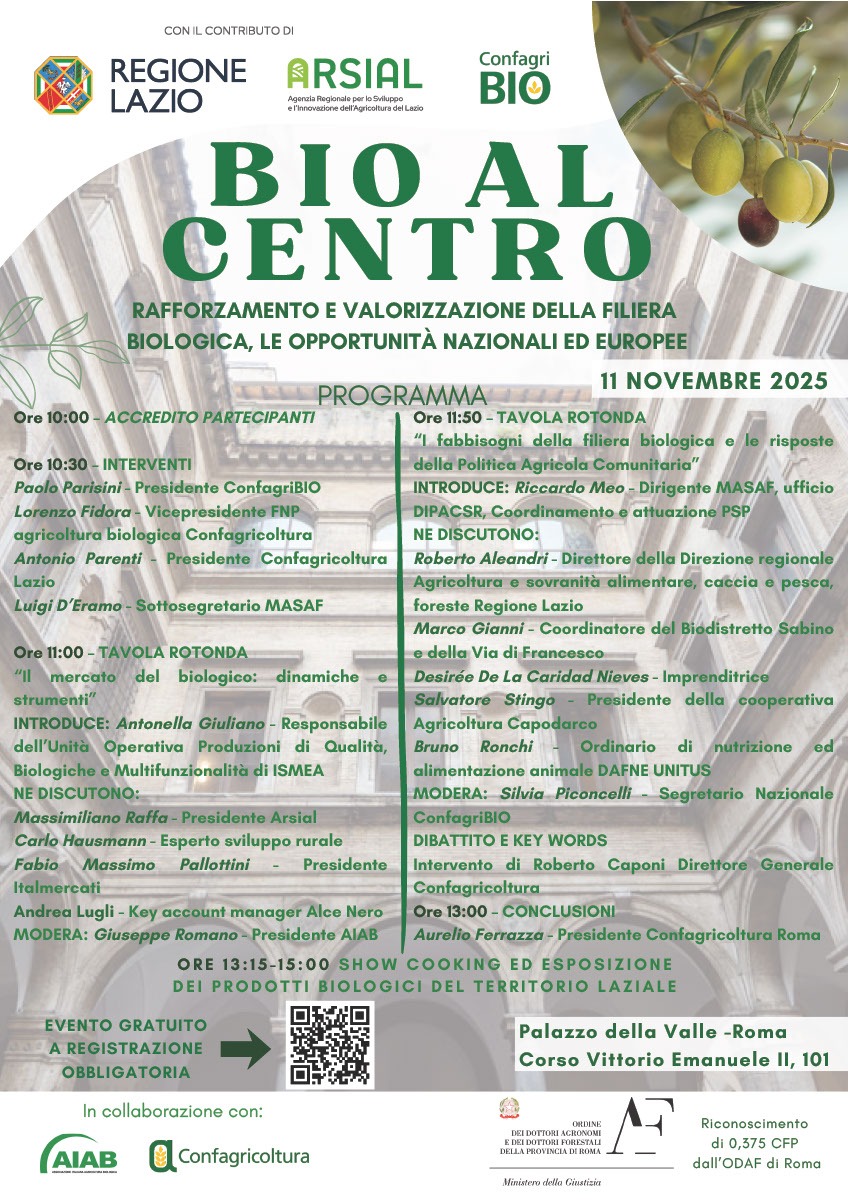 ConfagriBIO, l’associazione di Confagricoltura dedicata al biologico, in collaborazione con AIAB e la Regione Lazio tramite ARSIAL, organizza “BIO AL CENTRO – I prodotti biologici della campagna laziale dritti al cuore di Roma”. L’iniziativa è finalizzata a promuovere e valorizzare le eccellenze del biologico laziale, ed è strutturata in due eventi distinti che si terranno nelle giornate dell’11 e del 14 novembre prossimi.